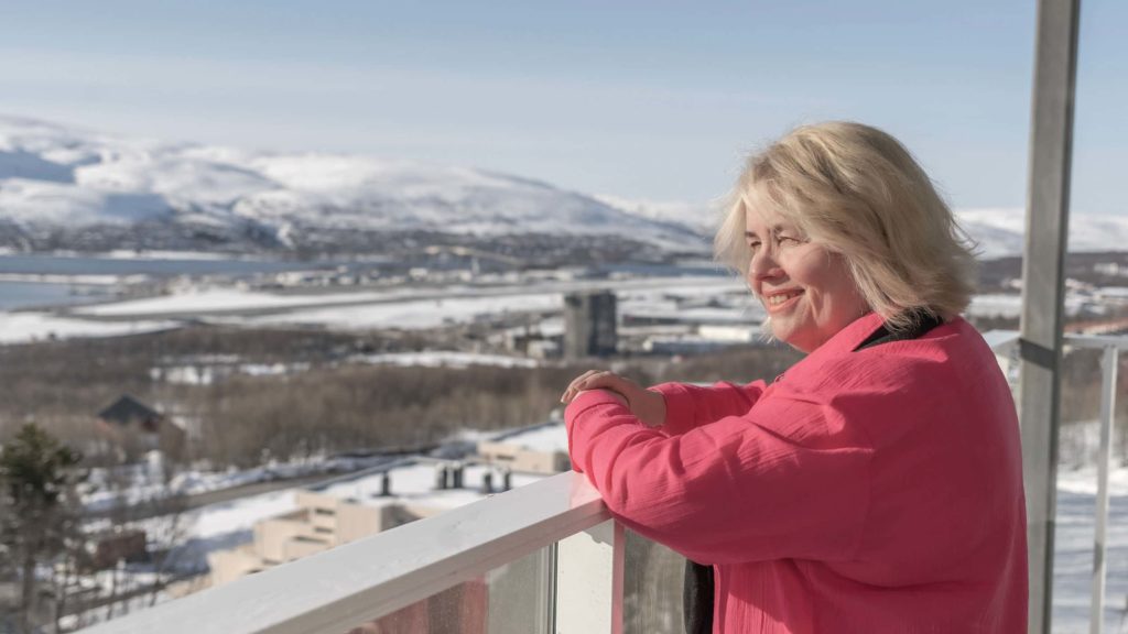 Mona vokste opp i Workinnmarka. Nå ser hun rett bort på barndomshjemmet fra leiligheten sin i Norrøna.